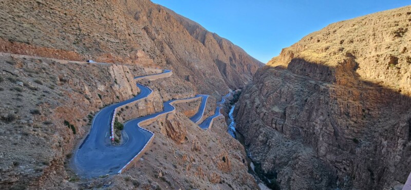 Unul dintre cele mai fotografiate locuri din zonă este faimosul drum cu serpentine în ac de păr de la Tissadrine. Priveliștea de sus este absolut impresionantă – șoseaua se încolăcește pe stânci într-un dans amețitor, iar dedesubt se vede verdele oazei care contrastează dramatic cu roșul canionului. E o porțiune iubită de motocicliști, fotografi și aventurieri.