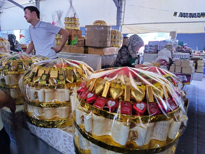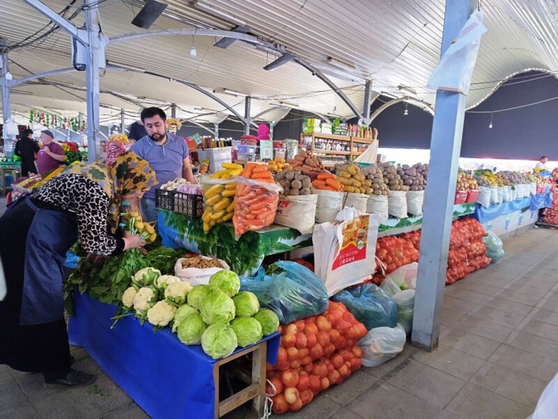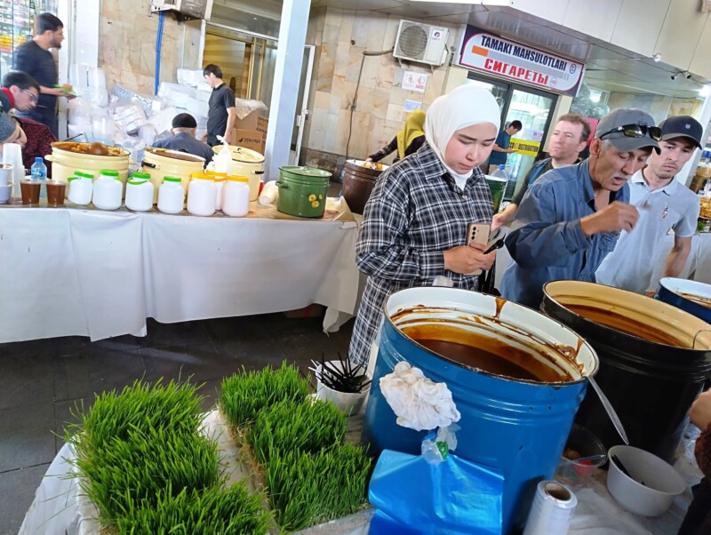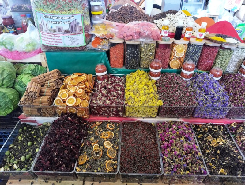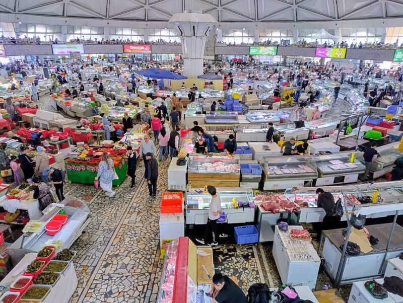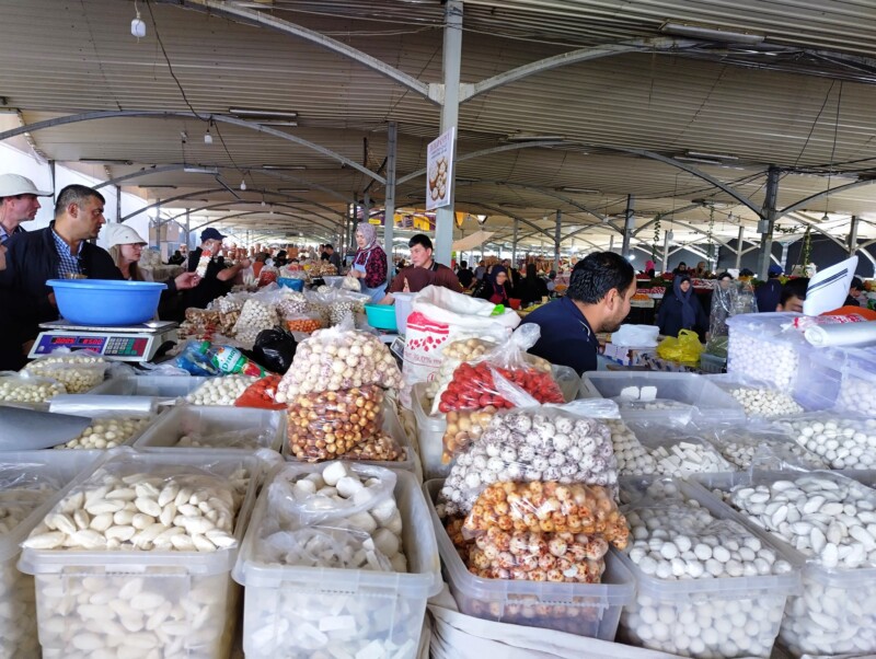 Bazarurile din Samarkand erau diferite față de cele din Tașkent – mai vechi, mai orientale. Aici am văzut pentru prima dată carne de oaie și chiar de cămilă, expusă fără prea multă formalitate. Bucăți mari, roșii, atârnate în aerul cald, cu muște leneșe în jur. Mirosul era puternic, dar oamenii cumpărau liniștiți, negociau, râdeau.