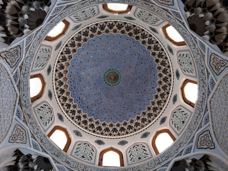 Arhitectură islamică spectaculoasă, cu faianță albastră și mozaicuri.