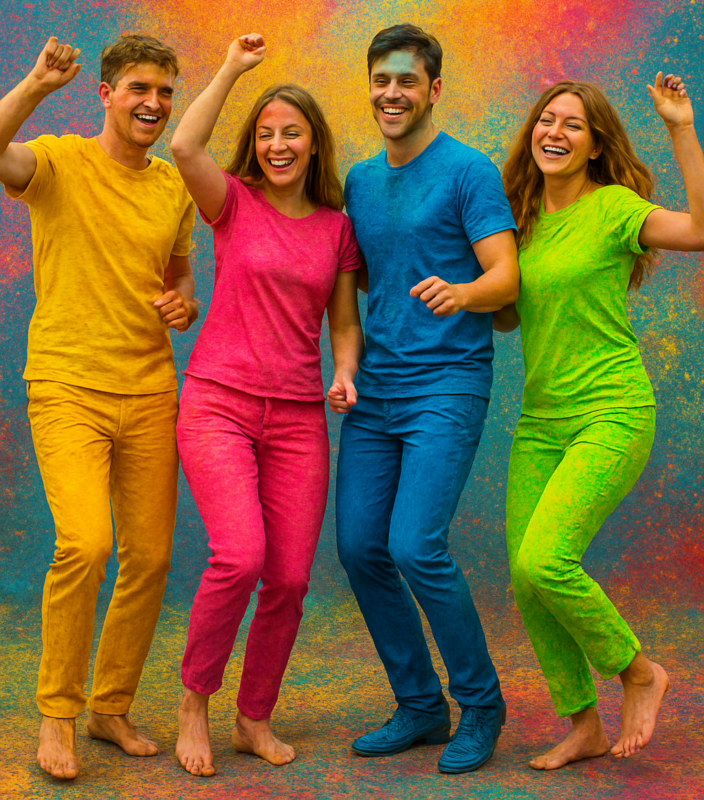 De recomandat: rosu aprins, albastru regal, albastru cyan, verde crud, galben, neon (roz, verde, galben), portocaliu. Valabil si la baieti si la femei. Imprumutati, improvizati, ganditi-va la orice posibilitate, dar sa veniti imbracati in ton si tema.