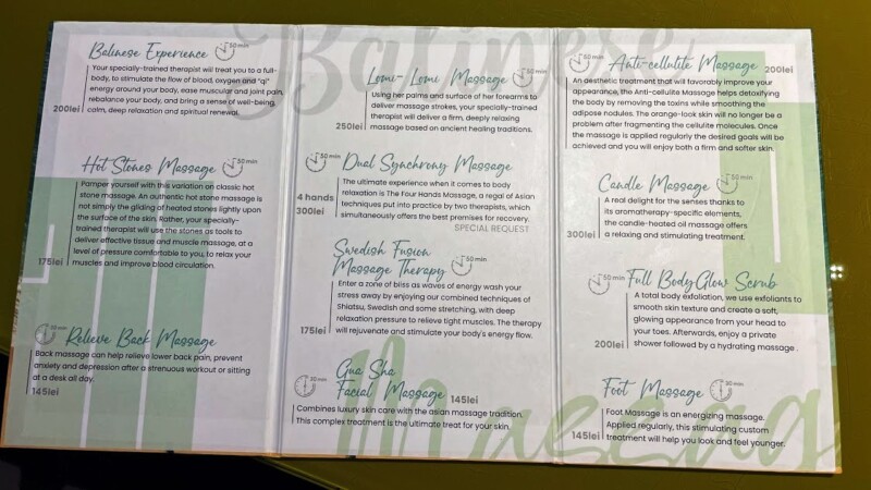 Am facut o fotografie a tipurilor de masaje si tarifele aferente. Se achita direct acolo.