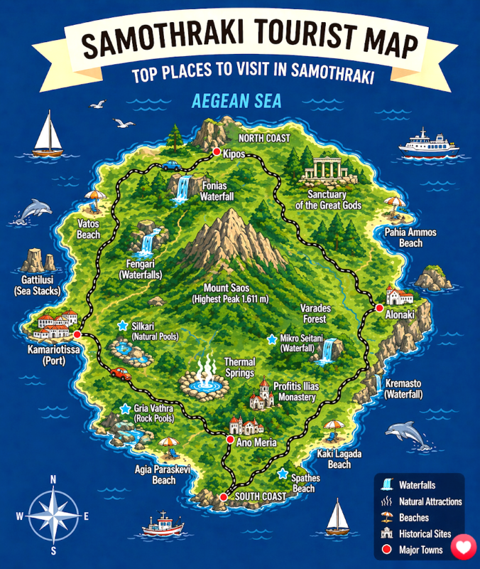 Samothraki nu este un loc cu hoteluri all inclusive, plaje intinse cu nisip...Este un altfel de paradis turistic in care te poti bucura de aerul si linistea unei destinatii mai putin comerciale. Sunteti acolo mai apropiati de natura, puteti explora un loc mai putin asaltat de turisti.