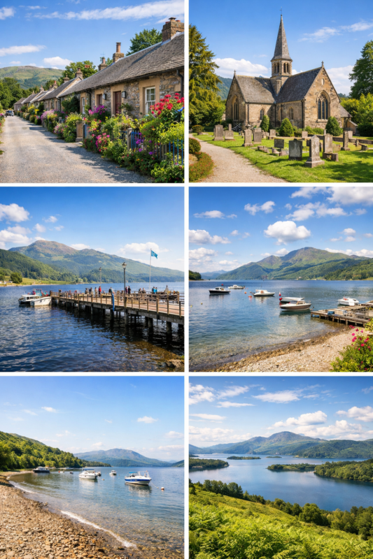 De la biserică, drumul coboară ușor spre lac, iar după câteva minute se ajunge la pontonul satului. Aici se deschide una dintre cele mai frumoase priveliști asupra lacului Loch Lomond. Apa se întinde calmă până la linia munților din depărtare, iar pe suprafața lacului se văd uneori bărci mici sau caiace alunecând aproape fără zgomot. Dimineața, ceața se ridică lent dintre insule, iar seara, apusul colorează lacul în nuanțe aurii și roșiatice.