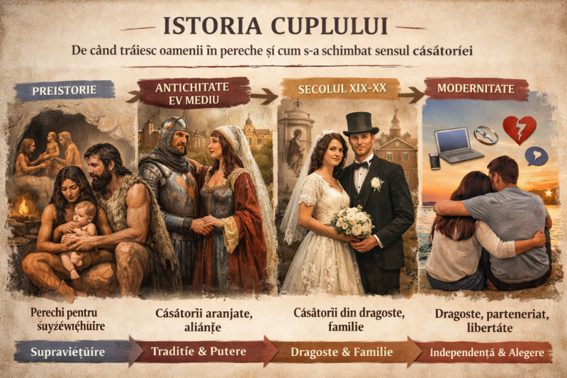 Ideea de „cuplu” pare astăzi atât de firească încât mulți o consideră aproape naturală și neschimbată. Totuși, istoria relațiilor dintre femei și bărbați, dintre parteneri, a fost mult mai variată decât ne imaginăm. Oamenii nu au iubit, nu au conviețuit și nu s-au căsătorit mereu din aceleași motive. Cuplul, așa cum îl înțelegem azi — bazat pe alegere personală, afecțiune și compatibilitate — este rezultatul unei evoluții foarte lungi.