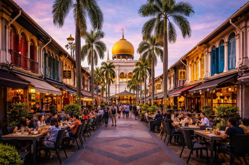 În Kampong Glam, cupola aurie a moscheii domină un cartier plin de viață, artă și influențe arabe.